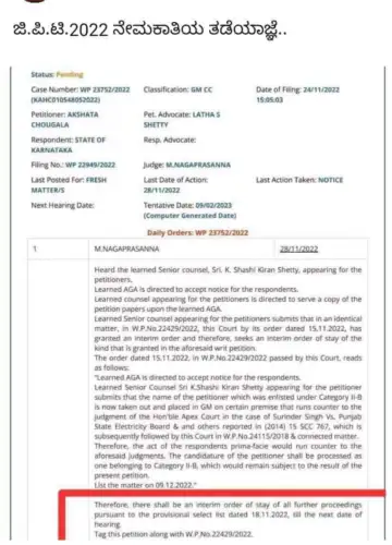 ಶಿಕ್ಷಣ ಇಲಾಖೆ ಪ್ರಕಟಿಸಿದಂತ ಪದವೀಧ ಪ್ರಾಥಮಿಕ ಶಾಲಾ ಶಿಕ್ಷಕರ ನೇಮಕಾತಿಯ ತಾತ್ಕಾಲಿಕ ಆಯ್ಕೆ ಪಟ್ಟಿ ಸಂಬಂಧ ಅಕ್ಷತ ಚೌಗಲೆ ಎಂಬುವರು ಹೈಕೋರ್ಟ್ ಮೆಟ್ಟಿಲೇರಿದ್ದರು. ಅವರ ಪರವಾಗಿ ಲತಾ ಶೆಟ್ಟಿ ಎಂಬುವಂತ ವಕೀಲರು ವಾದಿಸಿದ್ದರು.