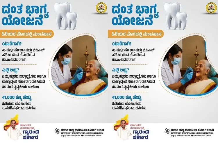 ಬೆಂಗಳೂರು: ರಾಜ್ಯದ ಹಿರಿಯ ನಾಗರಿಕರ ಮುಖದಲ್ಲಿ ಮಂದಹಾಸ ಮೂಡಿಸುವ ನಿಟ್ಟಿನಲ್ಲಿ ಕರ್ನಾಟಕ ಸರ್ಕಾರವು 'ದಂತ ಭಾಗ್ಯ' ಯೋಜನೆಯನ್ನು ಪರಿಣಾಮಕಾರಿಯಾಗಿ ಜಾರಿಗೊಳಿಸುತ್ತಿದೆ. ಬಡತನ ರೇಖೆಗಿಂತ ಕೆಳಗಿರುವ (BPL) ಹಿರಿಯ ನಾಗರಿಕರಿಗೆ ಉಚಿತ ದಂತ ಚಿಕಿತ್ಸೆ ಮತ್ತು ಕೃತಕ ಹಲ್ಲುಗಳನ್ನು ಅಳವಡಿಸುವುದು ಈ ಯೋಜನೆಯ ಮುಖ್ಯ ಉದ್ದೇಶವಾಗಿದೆ.