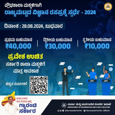 ಬೆಂಗಳೂರು : ಜವಾಹರಲಾಲ್ ನೆಹರು ತಾರಾಲಯ, ಕರ್ನಾಟಕ ವಿಜ್ಞಾನ ಮತ್ತು ತಂತ್ರಜ್ಞಾನ ಪ್ರೋತ್ಸಾಹಕ ಸೊಸೈಟಿ, ಶಾಲಾ ಶಿಕ್ಷಣ ಇಲಾಖೆ ಸಹಯೋಗದೊಂದಿಗೆ ಸರ್ಕಾರಿ ಪ್ರೌಢಶಾಲೆ ವಿದ್ಯಾರ್ಥಿಗಳಿಗಾಗಿ ಕನ್ನಡದಲ್ಲಿ ರಾಜ್ಯಮಟ್ಟದ ವಿಜ್ಞಾನ ರಸಪ್ರಶ್ನೆ ಸ್ಪರ್ಧೆ ಆಯೋಜಿಸಲಾಗಿದೆ.