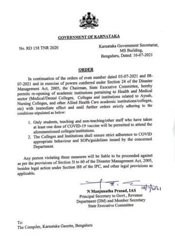 ಈ ಕುರಿತಂತೆ ಕಂದಾಯ ಇಲಾಖೆಯ ಸರ್ಕಾರದ ಪ್ರಧಾನ ಕಾರ್ಯದರ್ಶಿ ಎನ್ ಮಂಜುನಾಥ ಪ್ರಸಾದ್ ಆದೇಶ ಹೊರಡಿಸಿದ್ದು, ಕೊರೋನಾ ಸೋಂಕಿನ ಪಾಸಿಟಿವಿಟಿ ದರಗಳ ಇಳಿಕೆಯ ಬಿನ್ನಲೆಯಲ್ಲಿ ಆರೋಗ್ಯ ಮತ್ತು ಮೆಡಿಕಲ್ ಸೆಕ್ಟರ್ ( ಮೆಡಿಕಲ್, ಡೆಂಟಲ್ ಕಾಲೇಜ್, ಆಯುಷ್ ಕಾಲೇಜು ಮತ್ತು ಇನ್ಸಿಟಿಟ್ಯೂಷನ್ನ್, ನರ್ಸಿಂಗ್ ಕಾಲೇಜು ಮತ್ತು ಹೆಲ್ತ್ ಕೇರ್ ಅಕಾಡೆಮಿಕ್ ಇನ್ಟಿಟ್ಯೂಷನ್, ಕಾಲೇಜು ಇತರೆ) ಸಂಸ್ಥೆಗಳು ಕೂಡಲೇ ತೆರೆಯಲು ಈ ಕೆಳಗಿನ ಷರತ್ತುಗಳೊಂದಿಗೆ ಅನುಮತಿಸಿದ್ದಾರೆ.
