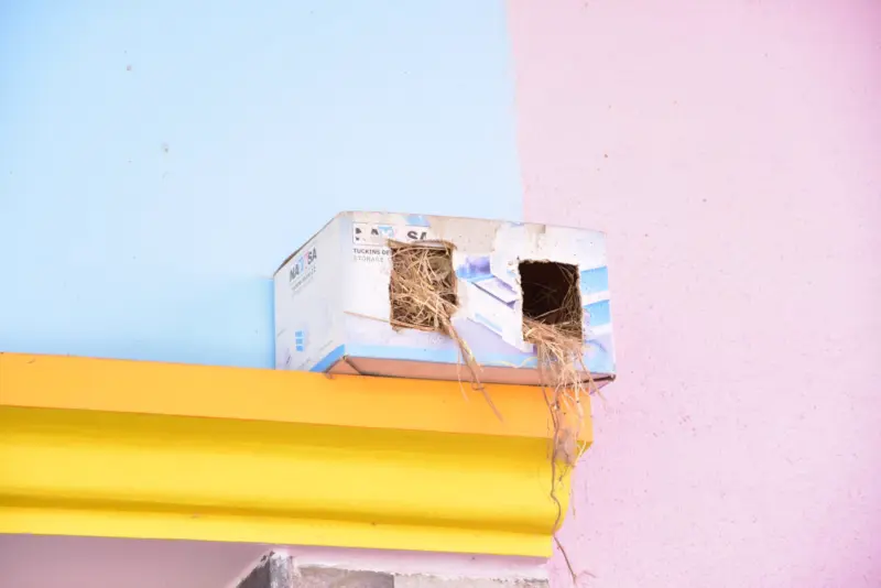 ರಟ್ಟು, ಪ್ಲಾಸ್ಟಿಕ್ ಡಬ್ಬಗಳನ್ನು ಕತ್ತರಿಸಿ ಸರಾಗವಾಗಿ ಒಳ ಹೋಗಿ ಬರಲು ಅನುಕೂಲವಾಗುವ ರೀತಿಯಲ್ಲಿ ಮನೆಗಳ ಮಾಲೀಕರು ಗುಬ್ಬಿ ಗೂಡು ನಿರ್ಮಿಸಿದ್ದಾರೆ.