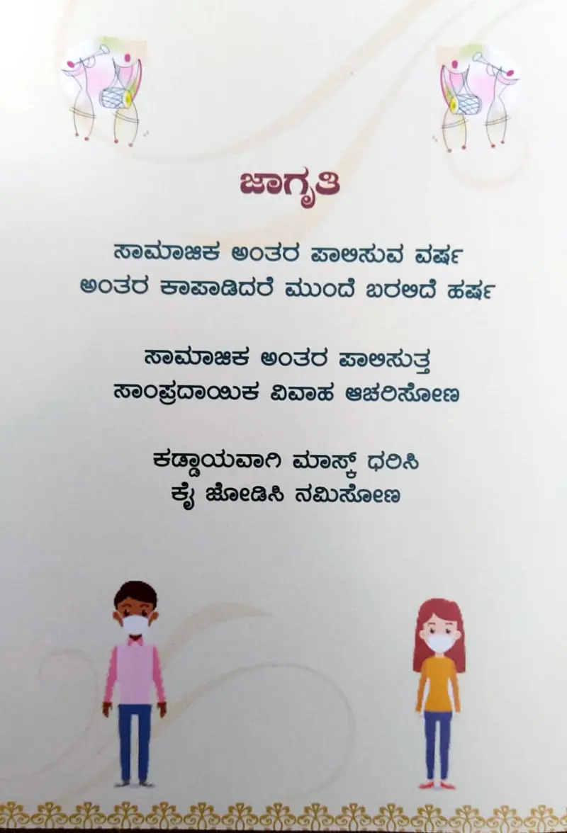 ಆಮಂತ್ರಣ ಪತ್ರದಲ್ಲಿ ಕೋವಿಡ್ ಜಾಗೃತಿ ಸಂದೇಶಗಳನ್ನು ಮುದ್ರಿಸಿದ್ದಾರೆ.