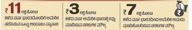 ₹11 ಲಕ್ಷ ಕೋಟಿ ಕಳೆದ ವರ್ಷ ಭಾರತದೊಂದಿಗೆ ಅಮೆರಿಕ ನಡೆಸಿರುವ ಒಟ್ಟು ಅಂದಾಜು ವ್ಯಾಪಾರ ₹3 ಲಕ್ಷ ಕೋಟಿ |ಕಳೆದ ವರ್ಷ ಅಮೆರಿಕ ಭಾರತಕ್ಕೆ ರಫ್ತು ಮಾಡಿರುವ ಸರಕುಗಳ ಮೌಲ್ಯ ₹7 ಲಕ್ಷ ಕೋಟಿ |ಕಳೆದ ವರ್ಷ ಭಾರತದಿಂದ ಅಮೆರಿಕ ಆಮದು ಮಾಡಿಕೊಂಡಿರುವ ಸರಕುಗಳ ಮೌಲ್ಯ