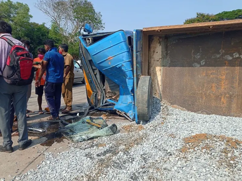 ಬ್ರೇಕ್ ಜಾಮ್ ಆದ ಪರಿಣಾಮ ರಸ್ತೆ ಲಾರಿ ಮಗುಚಿ ಬಿದಿದ್ದು, ಇದರಿಂದ ಎದುರಿನಿಂದ ಬರುತ್ತಿದ್ದ ಕಾರಿಗೆ ಹಾನಿಯಾಗಿದೆ. ಲಾರಿ ಸಂಪೂರ್ಣ ನಜ್ಜು ಗುಜ್ಜು ಆಗಿದ್ದು, ಘಟನೆಯಲ್ಲಿ ಯಾರಿಗೂ ಗಾಯಗಳಾಗಿಲ್ಲ. ಅಪಘಾತದಿಂದ ರಸ್ತೆಯಲ್ಲಿ ಜಲ್ಲಿ ಚೆಲ್ಲಾಪಿಲ್ಲಿಯಾಗಿ ಬಿದ್ದಿತ್ತು.