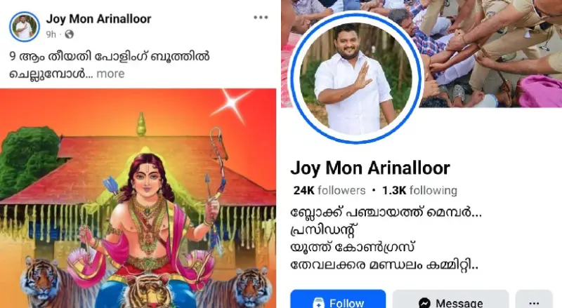 കൊല്ലം ജില്ലയിലെ ചവറ ബ്ലോക്ക് പഞ്ചായത്ത് മൂന്നാം ഡിവിഷൻ മെമ്പർ ജോയിമോൻ അരിനല്ലൂരാണ് സമൂഹ മാധ്യമങ്ങളില് മത ചിഹ്നം ഉപയോഗിച്ച് യുഡിഎഫ് സ്ഥാനാർത്ഥിക്കായി വോട്ട് അഭ്യർത്ഥിച്ചത്. ശബരിമല അയ്യപ്പൻ്റെ ചിത്രം ഉപയോഗിച്ചാണ് പ്രചരണം. ഭിന്നിപ്പിച്ച് വോട്ട് നേടാനുള്ള ശ്രമങ്ങള് കോണ്ഗ്രസ് നടത്താനുള്ള ശ്രമങ്ങള് കോണ്ഗ്രസിന്റെ ഭാഗത്ത് നിന്ന് ശക്തമാണെന്ന് ഇതില് നിന്ന് വ്യക്തമാണ്. കോണ്ഗ്രസിന്റെ മണ്ഡലം കമ്മിറ്റി പ്രസിഡന്റാണ് ഇയാള്