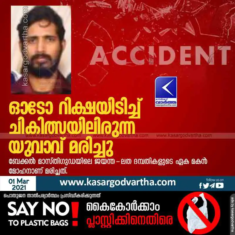 ബേക്കല് മാസ്തിഗുഡയിലെ ജയന്ത - ലത ദമ്ബതികളുടെ ഏക മകന് മോഹന് (32) ആണ് മരിച്ചത്. കഴിഞ്ഞ ദിവസം രാത്രി ബേക്കല് കോട്ടക്കുന്ന് അറളിക്കട്ടയില് വെച്ചാണ് മോഹനനെ ഓടോറിക്ഷ ഇടിച്ചത്.