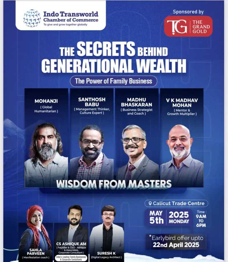 കുടുംബ വ്യവസായത്തെ അടുത്ത തലമുറയിലേക്ക് വിജയകരമായി കൈമാറാൻ ആവശ്യമായ തന്ത്രങ്ങളും മൂല്യങ്ങളും പങ്കുവെക്കുന്ന Business Conclave “The SECRETS behind Generational WEALTH – The POWER of FAMILY BUSINESS” മേയ് 5, 2025-ന് കാലിക്കറ്റ് ട്രേഡ് സെന്ററിൽ നടക്കും. രാവിലെ 9 മുതൽ വൈകിട്ട് 6 വരെ നീണ്ടുനിൽക്കുന്ന ഈ ഒരു ദിന പരിപാടി, പുതിയ തലമുറയിലേക്കുള്ള ബിസിനസ് പൈതൃകത്തിനുള്ള വഴികൾ തുറന്ന് കാണിക്കും.