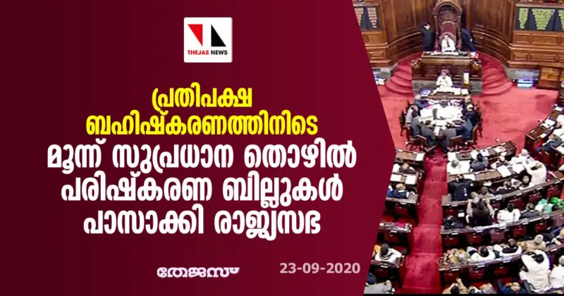 300 തൊഴിലാളികള് വരെയുള്ള സ്ഥാപനങ്ങളിലെ ജീവനക്കാരെ സര്ക്കാരിന്റെ യാതൊരു അനുമതിയുമില്ലാതെ പിരിച്ചുവിടാമെന്നും ആവശ്യമെങ്കില് സ്ഥാപനം പൂട്ടാമെന്നതുമടക്കമുള്ള മൂന്ന് തൊഴില് പരിഷ്കരണ ബില്ലുകളാണ് ഇന്ന് രാജ്യസഭ പാസാക്കിയത്. പ്രതിപക്ഷ എംപിമാര് സഭ ബഹിഷ്കരിച്ച് പുറത്ത് പ്രതിഷേധിക്കുന്ന ഘട്ടത്തിലാണ് സുപ്രധാന ബില്ലുകള് ശബ്ദ വോട്ടോടുകൂടി സഭ പാസാക്കിയിരിക്കുന്നത്.