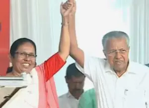 എല്ഡിഎഫ് സ്ഥാനാർത്ഥി കെ.കെ. ശൈലജയുടെ കൈപിടിച്ചുയർത്തി അണികളെ അഭിവാദ്യം ചെയ്ത മുഖ്യമന്ത്രി, മണ്ഡലം തിരിച്ചുപിടിക്കുമെന്ന ഉറച്ച വിശ്വാസം പ്രകടിപ്പിച്ചു.(LDF led Kerala forward, Chief Minister raises KK Shailaja’s hand)