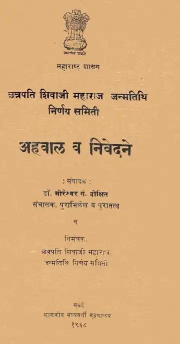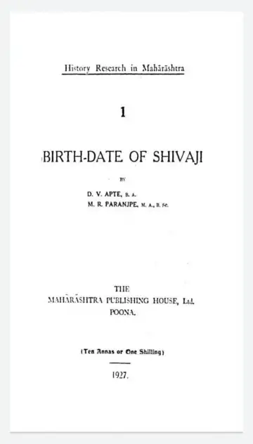 Book/Birth Date of Shivajiडी. व्ही. आपटे आणि एम. आर. परांजपे लिखित 'Birth Date of Shivaji' पुस्तकडी. व्ही. आपटे आणि एम. आर. परांजपे यांनी 'Birth Date of Shivaji' नावाने लिहिलेल्या पुस्तकात हे नमूद केले आहे. आपटे आणि परांजपे यांचे पुस्तक 'द महाराष्ट्रा पब्लिशिंग हाऊस लिमिटेडटने 1927 साली प्रकाशित केले आहे.