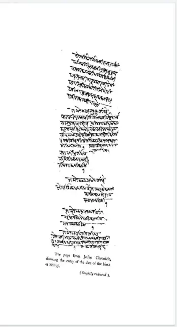 Book/Birth Date of Shivajiजोधपूरमध्ये सापडलेली शिवाजी महाराजांची जन्मपत्रिकात्यात मारवाडी भाषेत नोंद केली आहे - ||संवत 1686 फागूण वदि ३ शुक्रे उ. घटी 30|9 राजा शिवाजी जन्मः || संवत 1686 फाल्गुन वद्य 3 म्हणजेच फाल्गुन वद्य तृतिया शके 1551 (सन 1630).