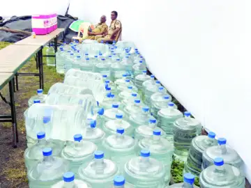 पंतप्रधान नरेंद्र मोदी यांच्या सभेसाठी आलेल्या नागरिकांना पिण्यासाठी मोठ्या प्रमाणात मागविलेले पाण्याचे जार.