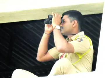 पंतप्रधान नरेंद्र मोदी यांच्या सभेप्रसंगी सभा परिसरातील घटनांवर दुर्बिणीच्या सहाय्याने लक्ष ठेवताना पोलीस कर्मचारी.