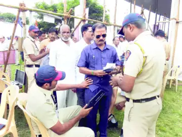 सुरक्षेच्या पार्श्वभूमीवर सभेच्या ठिकाणी नागरिकांसोबत असलेल्या साहित्याची तपासणीसाठी ठेवण्यात आलेली अत्याधुनिक व्यवस्था.