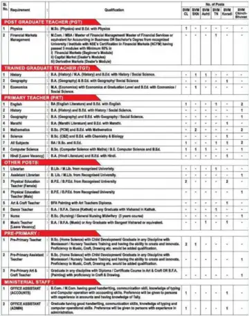 - पदाचे नाव - पीडीटी, टीजीटी, पीआरटी, ग्रंथपाल, सहायक ग्रंथपाल, शारीरिक शिक्षण शिक्षिका (महिला), शारीरिक शिक्षण शिक्षिका (माला), कला व हस्तकला शिक्षिका, नृत्य शिक्षिका, नर्स, संगीत शिक्षिका [रजेवरील रिक्त जागा], पूर्व-प्राथमिक शिक्षिका, पूर्व-प्राथमिक सहायक शिक्षिका, पूर्व-प्राथमिक कला व हस्तकला शिक्षिका, कार्यालय सहायक (लेखा), कार्यालय सहायक (प्रशासन)