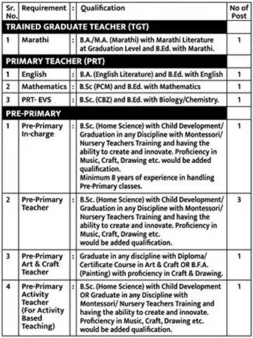 - पदाचे नाव - प्रशिक्षित पदवीधर शिक्षक (TGT), प्राथमिक शिक्षक (PRT), पूर्व-प्राथमिक