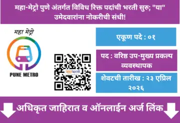 महा-मेट्रो पुणे अंतर्गत "वरिष्ठ उप-मुख्य प्रकल्प व्यवस्थापक" पदांच्या एकूण 01 रिक्त जागा भरण्यासाठी पदांनुसार पात्र असणाऱ्या उमेदवारांकडून अर्ज मागविण्यात येत आहे. अर्ज ऑफलाईन पद्धतीने करायचा आहे. अर्ज करण्याची शेवटची तारीख २३ एप्रिल २०२६आहे.