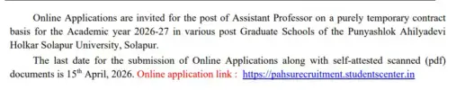 Online Applications are invited for the post of Assistant Professor on a purely temporary contract basis for the Academic year 2026-27 in various Graduate and Post Graduate Schools of the Punyashlok Ahilyadevi Holkar Solapur University, Solapur. There are a total of 133 vacancies available. The online application opens on 30-03-2026 and closes on 15-04-2026. Always check the official https://su.digitaluniversity.ac/ website for updates. For more details about Solapur University Recruitment 2026 Details, Solapur University Application 2026, Solapur University Job 2026, Solapur University Vacancy 2026, Solapur University Bharti 2026, visit our website www.MahaBharti.in.
