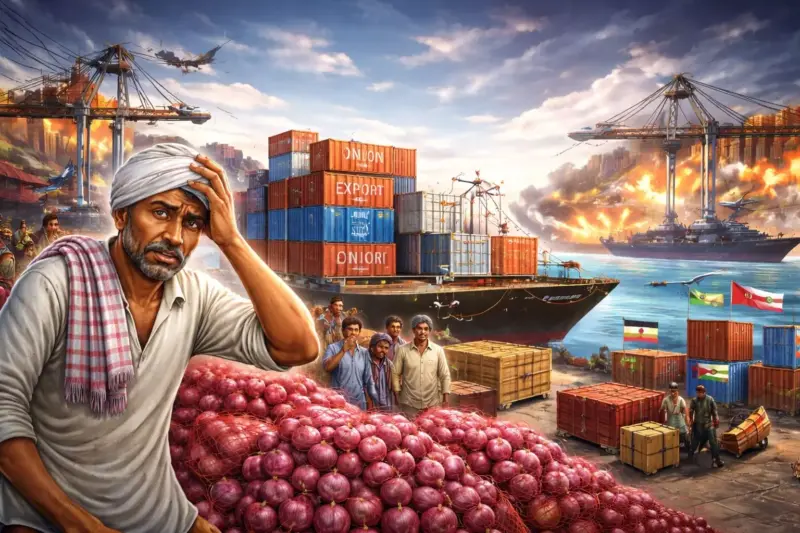 onion export India, onion export decline India, onion prices crash India, farmer crisis India, agriculture crisis India, Iran US conflict impact India, Middle East war impact on India, onion market India, Lasalgaon onion market news, Nashik onion price today