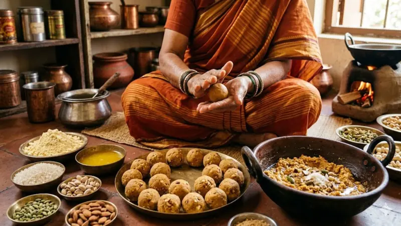 आधुनिक रूप: ब्रिटिश काळात साखर आल्यावर (किंवा त्यापूर्वी गूळापासून) लाडू 'औषध' पासून 'स्वादिष्ट मिठाई' बनला. तो सहज वाहून नेण्यायोग्य, दीर्घकाळ टिकणारा आणि उत्सवांसाठी आदर्श ठरला.