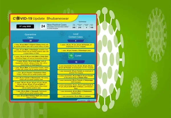 ଭୁବନେଶ୍ୱର,୩।୭(ବ୍ୟୁରୋ): ରାଜଧାନୀରେ ଶୁକ୍ରବାର ୨୪ ନୂଆ କରୋନା ପଜିଟିଭ୍ ଚିହ୍ନଟ ହୋଇଛନ୍ତି। ସେଥିରେ ୨୦ କ୍ୱାରାଣ୍ଟାଇନ୍ ଆକ୍ରାନ୍ତ ଥିବା ବେଳେ ୪ ଲୋକାଲ କେସ୍ ରହିଛି। ଏହାଛଡ଼ା ୧୫ଜଣ ସୁସ୍ଥ ହୋଇ ଘରକୁ ଫେରିଥିବା ନେଇ ବିଏମ୍ସି ପକ୍ଷରୁ ଅପରାହ୍ନରେ ଟୁଇଟ୍ କରି ସୂଚନା ଦିଆଯାଇଛି। ନୂତନ ଆକ୍ରାନ୍ତଙ୍କୁ ମିଶାଇ ଭୁବନେଶ୍ୱରରେ ମୋଟ ଆକ୍ରାନ୍ତଙ୍କ ସଂଖ୍ୟା ୩୬୯କୁ ବୃଦ୍ଧି ପାଇଛି। ଏଥି ମଧ୍ୟରୁ ୨୧୬ଜଣ ସୁସ୍ଥ ହୋଇ ଘରକୁ ଫେରିଥିବା ବେଳେ ୧୪୮ ସକ୍ରିୟ କେସ୍ ରହିଛି। ୪ଜଣଙ୍କ ମୃତ୍ୟୁ ଘଟିଥିବା ବିଏମ୍ସି ପକ୍ଷରୁ କୁହାଯାଇଛି।