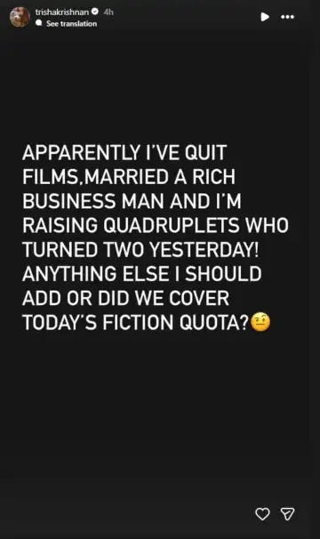இந்த நிலையில் இந்த வதந்திகளுக்கு, தனது இன்ஸ்டாகிராம் பக்கத்தில் நகைச்சுவையாக ஒரு பதிலடி கொடுத்துள்ளார் த்ரிஷா. அதில் அவர், “நான் கேள்விப்பட்ட வரைக்கும் நான் சினிமாவில் இருந்து விலகி விட்டேன்.. ஒரு கோடீஸ்வர தொழிலதிபரை திருமணம் செய்து கொண்டேன்.. இரண்டு வயதில் எனக்கு நான்கு குழந்தைகள் உள்ளது, வேறு எதையாவது நான் இதில் சேர்க்க வேண்டுமா? அல்லது உங்களின் கற்பனை முடிந்து விட்டதா?” என்று மிகவும் நக்கலாகப் பதிவிட்டுள்ளார்.