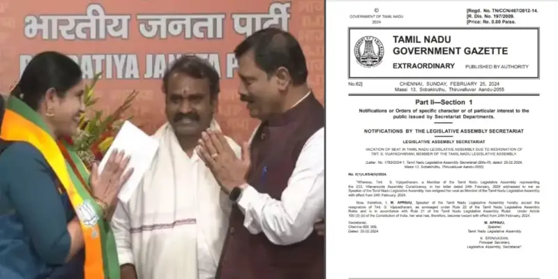 இந்த நிலையில், விளவங்கோடு சட்டப்பேரவைத் தொகுதி ஜனவரி 24ம் தேதியில் இருந்து காலியானதாக தமிழக அரசின் அரசிதழில் வெளியிடப்பட்டுள்ளது. விளவங்கோடு சட்டமன்ற உறுப்பினர் விஜயதரணி தனது பதவியை ராஜினாமா செய்ததை அடுத்து அந்த தொகுதி காலியானதாக அறிவிக்கப்பட்டது.