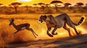 அப்போது தூரத்தில் கருப்பு மான் ஒன்றையும், புள்ளிமான் ஒன்றையும் பார்க்கிறது. இதை பார்த்த சிறுத்தைக்கு எதை துரத்துவது என்று முடிவெடுக்க முடியவில்லை. இதேசமயம், சிறுத்தையை பார்த்த மான்கள் அதிச்சியடைந்து ஒன்று வலப்பக்கமாகவும், இன்னொன்று இடப்பக்கமாகவும் ஓடத்தொடக்குகிறது.