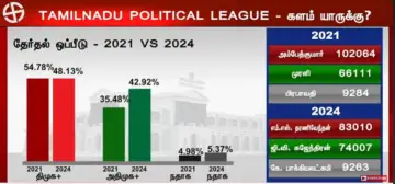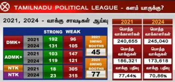 தேர்தல் புள்ளிவிவரங்களைப் பார்த்தால், 2021 சட்டமன்ற தேர்தலில் திமுக 54.7 சதவீத வாக்குகளைப் பெற்று வெற்றி பெற்றது. ஆனால், 2024 நாடாளுமன்ற தேர்தலில் இது 48.1 சதவீதமாகக் குறைந்துள்ளது. அதே சமயம், அதிமுக தனது வாக்கு வங்கியை 35.4 சதவீதத்திலிருந்து (2021) 42.9 சதவீதமாக (2024) உயர்த்தி பலமான போட்டியை உருவாக்கியுள்ளது. நாம் தமிழர் கட்சி 2021-ல் 4.9 சதவீதத்திலிருந்து 2024-ல் 5.37 சதவீதமாகச் சற்று முன்னேறியுள்ளது. வாக்குச்சாவடி ஆய்வில், திமுக 192 பூத்களில் (2021) இருந்து 131 பூத்களுக்குக் (2024) குறைந்துள்ளது; அதிமுக 103-லிருந்து 119 பூத்களுக்குத் தனது பலத்தை அதிகரித்துள்ளது.