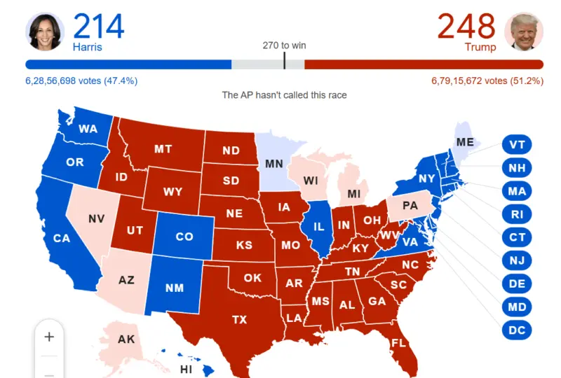 இதில் தற்போது கமலா ஹாரில் 214 (6,23,65,314 வாக்குகள் (47.4%)) எலக்டோரல் வாக்குகளையும், டிரம்ப் 248 (6,73,92,019 வாக்குகள் (51.2%)) எலக்டோரல் வாக்குகளையும் பெற்றுள்ளனர்.