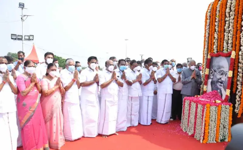 இந்நிகழ்ச்சியில் அமைச்சர்கள் திண்டுக்கல் சீனிவாசன், செல்லூர் ராஜூ, ஜெயக்குமார், காமராஜ், டாக்டர் சி.விஜயபாஸ்கர், பென்ஜமின் ஆகியோர் கலந்துக்கொண்டு காந்தியின் உருவப்படத்துக்கு மலர்தூவி மரியாதை செய்தனர்.
