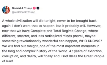 అమెరికా అధ్యక్షుడు డొనాల్డ్ ట్రంప్ తన ట్రూత్ సోషల్ ఖాతాలో తీవ్ర పదజాలంతో ఇరాన్ను హెచ్చరించారు. ఈ రాత్రికి ఒక మొత్తం నాగరికత అంతరించిపోతుంది, అది మళ్లీ ఎప్పటికీ తిరిగి రాదు. అలా జరగాలని నేను కోరుకోవడం లేదు, కానీ బహుశా అది జరుగుతుంది"అని ఆయన పేర్కొన్నారు. ఇరాన్లో 47 ఏళ్లుగా కొనసాగుతున్న అవినీతి,దోపిడీ, మరణాల యుగం ముగియబోతుందని ఆయన వ్యాఖ్యానించారు. ఈ ఘట్టం ప్రపంచ చరిత్రలోనే అత్యంత ముఖ్యమైన క్షణాల్లో ఒకటిగా నిలిచిపోతుందని ట్రంప్ అభివర్ణించారు.