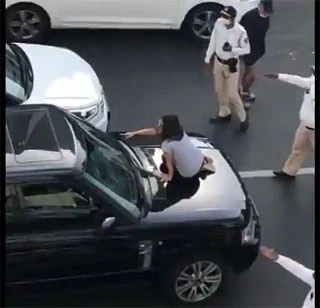కారు బోనెట్ మీదికి ఎక్కి చెప్పుతో కొడుతూ, కేకలు వేస్తూ ఆగ్రహంతో ఊగిపోయింది.