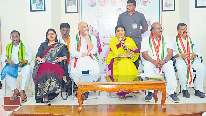 కాకినాడలోని డీసీసీ కార్యాలయంలో శనివారం ఏర్పాటు చేసి న నియోజకవ్గర్గ ఇనచార్జిలు, నాయకుల సమా వేశంలో ఆమె మాట్లాడారు. దీనికి జిల్లా కాం గ్రెస్ కమిటీ అధ్యక్షుడు మాదేపల్లి సత్యానంద రావు అధ్యక్షత వహించారు. అతిథులుగా కేంద్ర మాజీమంత్రి ఎంఎం పళ్లంరాజు, రాష్ట్ర కాంగ్రెస్ కిసాన సెల్ చైర్మన కామన ప్రభాకరరావు, ఏఐ సీసీ సంయుక్త కార్యదర్శి, డాక్టర్ పాలకవర్మ, జిల్లా ఇనచార్జి మేడా సురేష్ పాల్గొన్నారు. ముందుగా షర్మిలకు పార్టీ శ్రేణులు ఘన స్వా గతం పలికారు.