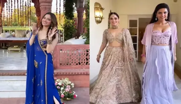 మిల్కీ బ్యూటీ తమన్నా తన స్నేహితురాలు హన్నా ఖాన్ పెళ్లి వేడుక కోసం రీసెంట్గా రాజస్థాన్లోని జైపూర్కు వెళ్ళింది. అక్కడ హన్నా ఖాన్ మెహందీ, సంగీత్ వేడుకలలో పాల్గొంటూ వాటికి సంబంధించిన ఫొటోలను సోషల్ మీడియాలో షేర్ చేసి ఫ్యాన్స్కు థ్రిల్ అందిస్తుంది. పెళ్ళి కుమార్తెకు పోటీగా తమన్నా రెడీ అవుతుంది. నీలం, బంగారు వర్ణం, ఎరుపు రంగు మోడరన్ లెహంగాల్లో తమన్నా అందం అదరహో అనేలా ఉంది. ప్రస్తుతం తమన్నాకు సంబంధించిన ఫొటోలు సోషల్ మీడియాలో తెగ హల్ చల్ చేస్తున్నాయి.