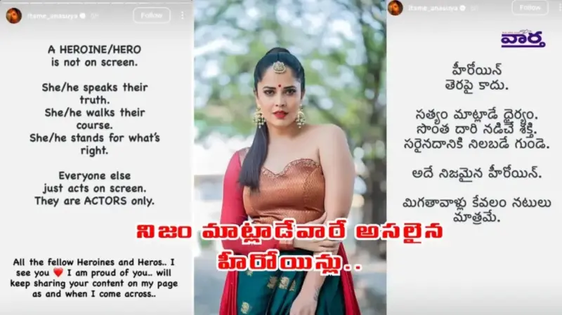 తెరపై అందంగా కనిపించే నటి మాత్రమే హీరోయిన్ కాదని, నిజం చెప్పే ధైర్యం ఉన్నవారు, తమ నిర్ణయాలపై నిలబడే శక్తి కలిగినవారు, అన్యాయానికి ఎదిరించే గుండె ఉన్నవారే నిజమైన హీరోయిన్లు అని అనసూయ పేర్కొన్నారు.