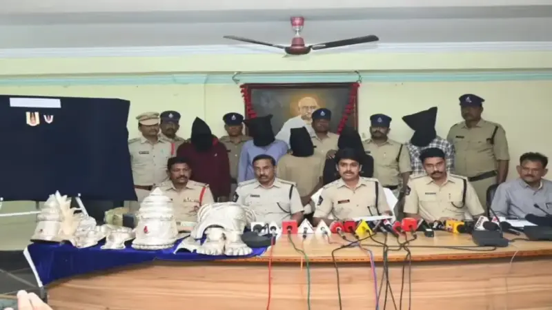 శ్రీకాకుళం జిల్లా (AP) కాశీబుగ్గలోని విజయ వేంకటేశ్వరస్వామి ఆలయంలో జరిగిన భారీ చోరీ కేసును పోలీసులు ఛేదించారు. ఈ ఘటనకు సంబంధించి ఐదుగురు సభ్యుల ముఠాను అరెస్ట్ చేసి, వారి వద్ద నుంచి సుమారు రూ.40.25 లక్షల బంగారం, వెండి, నగదును స్వాధీనం చేసుకున్నారు.