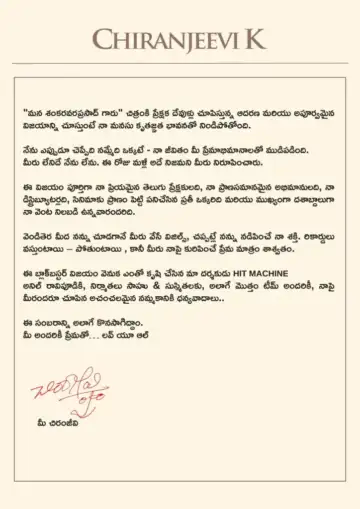 బాక్సాఫీస్ వద్ద 'మన శంకరవరప్రసాద్ గారు' భారీ విజయాన్ని అందుకోవడంతో మెగాస్టార్ చిరంజీవి(Chiranjeevi) తన ఆనందాన్ని అభిమానులతో పంచుకున్నారు. తెలుగు ప్రేక్షకులు, అభిమానులు ఎప్పటికప్పుడు అందిస్తున్న ఆదరణకు కృతజ్ఞతలు తెలుపుతూ ఆయన ఓ భావోద్వేగభరిత సందేశాన్ని సోషల్ మీడియాలో పోస్ట్( Emotional Post) చేశారు.