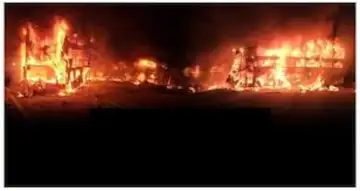 బస్సు టైరు ఒక్కసారిగా పేలింది. దీంతో బస్సు అదుపుతప్పి రోడ్డు మధ్యలో ఉన్న డివైడర్ను దాటింది. ఎదురుగా వస్తున్న కంటైనర్ లారీని బస్సు బలంగా ఢీకొట్టింది.. ఈ ప్రమాదంలో బస్సు డ్రైవర్, లారీ డ్రైవర్, క్లీనర్ అక్కడికక్కడే మరణించారు.ఈ క్రమంలో పది మందికి పైగా ప్రయాణికులకు స్వల్ప గాయాలయ్యాయి. ప్రమాద తీవ్రతకు బస్సు, లారీ పూర్తిగా దగ్ధమయ్యాయి. ప్రయాణికుల లగేజీ మొత్తం కాలి బూడిదైంది.