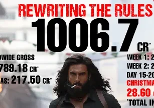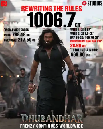 విడుదలైన కేవలం 21 రోజుల్లోనే ఈ చిత్రం ప్రపంచవ్యాప్తంగా రూ.1,000 కోట్ల గ్రాస్ వసూళ్లను దాటి అరుదైన రికార్డు సాధించింది. క్రిస్మస్ రోజున (డిసెంబర్ 25) ఈ మైలురాయిని అందుకున్నట్టు చిత్ర నిర్మాణ సంస్థలు జియో స్టూడియోస్, బీ62 స్టూడియోస్ అధికారికంగా వెల్లడించాయి. ఈ ఘనతతో రూ.1000 కోట్ల క్లబ్లోకి అడుగుపెట్టిన 9వ భారతీయ చిత్రంగా 'ధురంధర్' నిలిచింది.
