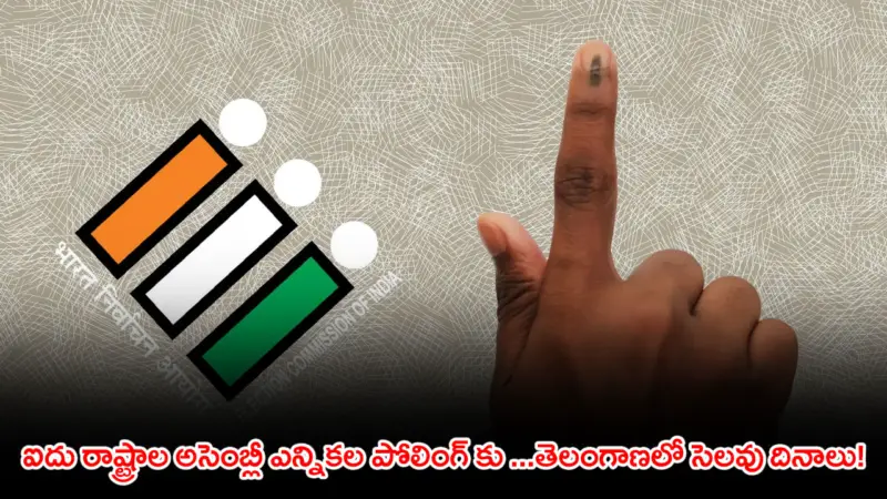 ఐదు రాష్ట్రాల అసెంబ్లీ ఎన్నికల పోలింగ్ సందర్భంగా తెలంగాణలో ప్రత్యేక సెలవులు ప్రకటించింది. ఓటు హక్కు వినియోగించుకునే వారికి జీతంతో సెలవు కల్పించింది.