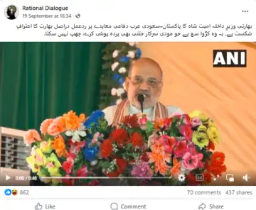 سوشل میڈیا پر ایک ویڈیو گردش کر رہی ہے، جس کے ساتھ دعویٰ کیا جا رہا ہے کہ بھارتی وزیرِ داخلہ امت شاہ نے ایک عوامی جلسے کے دوران بھارتی وزیرِ اعظم نریندر مودی کو پاکستان اور سعودی عرب کے دفاعی معاہدے پر تنقید کا نشانہ بنایا ہے۔